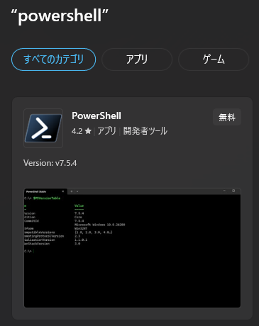 まず、PowerShell 7をインストールします。Microsoft Storeから「PowerShell」と検索してインストールできます。